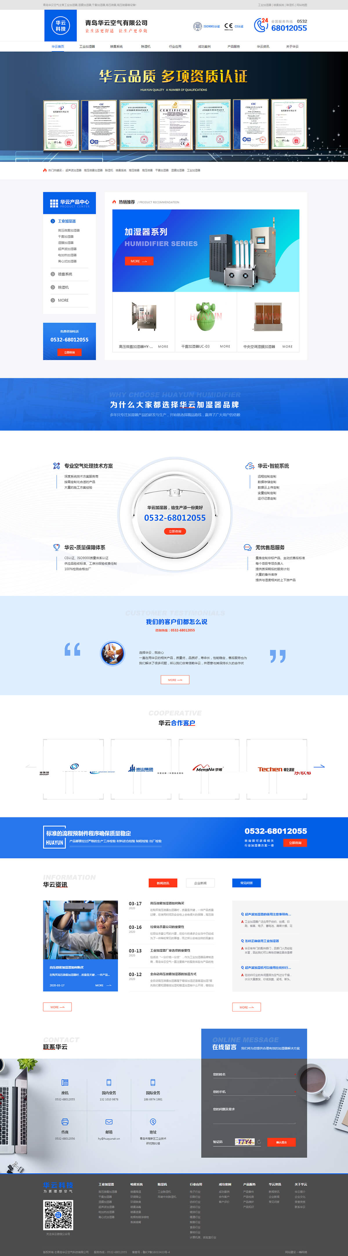 青島華云空氣科技有限公司是一家集生產、銷售、研發以及服務類這樣一家的綜合型企業,我們一直致力于為客戶提供全球性性價比較高的這樣一站式的空氣調節方案,我們的產品主要有加濕系統、除濕系統、降溫系統、凈化系統、噴霧系統以及空氣的調節,還有通風系統等。